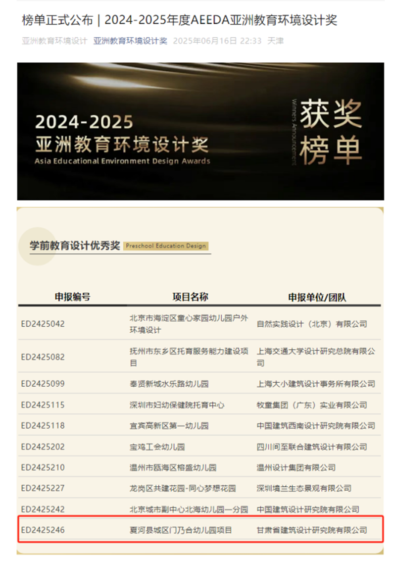 近日,備受矚目的2024-2025年度AEEDA亞洲教育環(huán)境設(shè)計獎(Asia Educational Environment Design Awards)獲獎名單正式揭曉。由甘肅工程咨詢集團(tuán)旗下省建筑設(shè)計院設(shè)計的夏河縣城區(qū)門乃合幼兒園項(xiàng)目,從百余件參賽作品中脫穎而出,榮膺學(xué)前教育設(shè)計領(lǐng)域優(yōu)秀獎,為甘肅建筑設(shè)計行業(yè)贏得了國際聲譽(yù)。