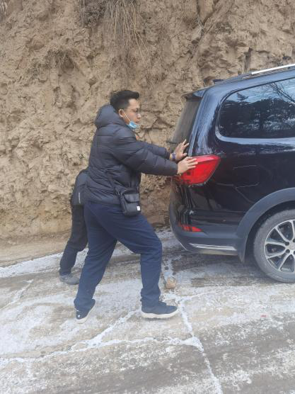 很多在隱患點上的行政村分布在舟曲縣周邊的大山高處,又逢舟曲剛下完大雪,山路崎嶇,道路積雪結冰,即使在車上套上防滑鏈還是無法到達一些村落。面對重重困難,工程師們沒有退縮,當積雪太深或結冰地路面太滑,車輛完全無法通行時,他們或推車前行,或頂風冒雪,深一腳淺一腳地步行好幾公里,走到開展工作的村子里去。
