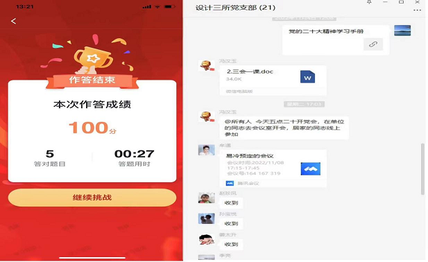以賽促學(xué),強(qiáng)技礪能精研細(xì)琢。各黨支部組織黨員通過學(xué)習(xí)強(qiáng)國“黨的二十大精神答題活動(dòng)”“黨的二十大精神應(yīng)知應(yīng)會(huì)百題”等形式,開展線上答題競賽,全面檢驗(yàn)黨員干部對黨的二十大報(bào)告內(nèi)容的掌握程度,進(jìn)一步增強(qiáng)黨員干部對學(xué)習(xí)黨的二十大精神的認(rèn)識和重視,推動(dòng)黨的二十大精神入腦入心,鞏固提升學(xué)習(xí)效果,以賽促學(xué)、以知促行,用黨的二十大精神武裝頭腦、指導(dǎo)實(shí)踐、推動(dòng)工作。