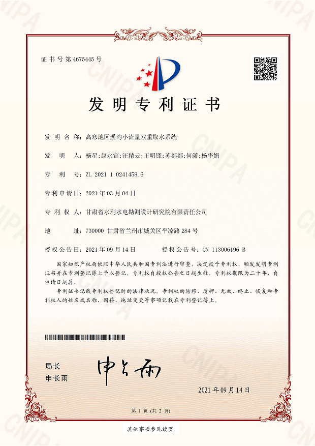 發明專利證書—高寒地區溪溝小流量雙重取水系統